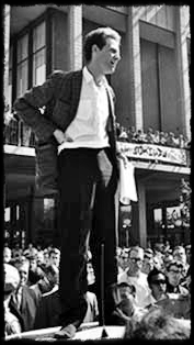 In all these events, Savio played no small part in the theater of protest. It was he who first mounted the roof of the police car, taking off his shoes so as not to dent it–a quite sincere act of decorum, though not one that prevented him from comparing the police to Adolph Eichmann (they all “had a job to do”). It was Savio who, before the sit-in, famously urged students to put their “bodies upon the gears and upon the wheels, upon the levers, upon all the apparatus, and…make [the machine] stop”–updating Luddism for the age of the Organization Man. And it was Savio who, at the Greek Theatre, publicly offered his own body to the cause, making his “machine” speech seem much more than mere metaphor.