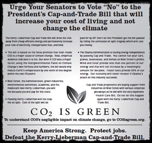 The front group “CO2 is Green” launched an advertising campaign this week with a half-page ad in The Washington Post urging people to pressure their senators to vote against the Senate’s “cap and trade” bill because, the ad says, “The bill is based on the false premise that man-made CO2 is a major cause of climate change.”