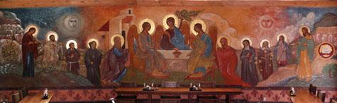 In the center of the Christ in the Desert mural is a large scale version of the Rubilev’s icon of the Trinity, represented by three angels, seated at table.