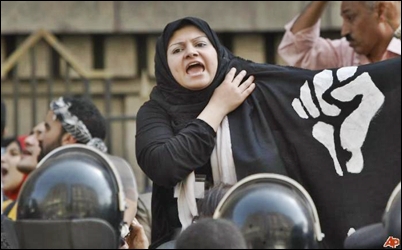 I chose this photo of Egypt’s nonviolent civil resistance movement because a) it shows a Muslim woman leading the charge and women were at the core of this revolutions leadership, b) it shows the helmets of the riot police up close and personal, and c) she is holding the “iron fist in a velvet glove” symbol adopted by the Serbian civil resistance movement that deposed Slobodan Milosevic in 2000. Serb student leaders helped train the Egyptian youth leaders in nonviolent tactics and philosophy.