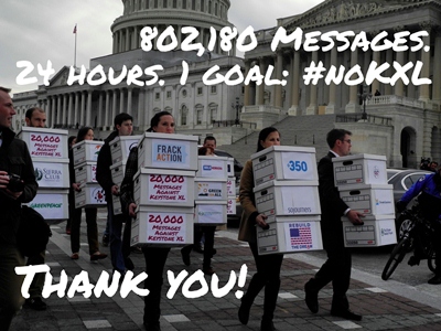 “The last 24 hours were the most concentrated blitz of environmental organizing since the start of the digital age,” explained McKibben. “Over 800,000 Americans made it clear that Keystone XL is the environmental litmus test for Senators and every other politician in the country. It’s the one issue where people have come out in large numbers to put their bodies on the line, and online too: the largest civil disobedience action on any issue in 30 years, and now the most concentrated burst of environmental advocacy perhaps since the battles over flooding the Grand Canyon ….”
