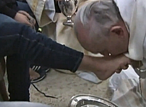 On Holy Thursday he washed the feet of 12 prisoners at a juvenile facility prison in Rome. Francis washed black feet, white feet, male feet, female feet and even a foot with tattoos. Kneeling on the stone floor as the 12 youngsters sat above him, the 76-year-old Francis poured water from a silver chalice over each foot, dried it with a simple cotton towel and then bent over to kiss each one. In addition to including girls and women in this service, also included were an Orthodox Christian and a young Muslim man. (The traditionalist custom has been to wash the feet of 12 retired priests in a high Mass in church.)