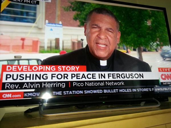 My brother in Christ, Rev. Alvin Herring (podium), had guns aimed at him last night in Ferguson, MO., as he attempted to nonviolently deescalate the violence in the aftermath of the waves of police-led domestic terrorism going on in Missouri.