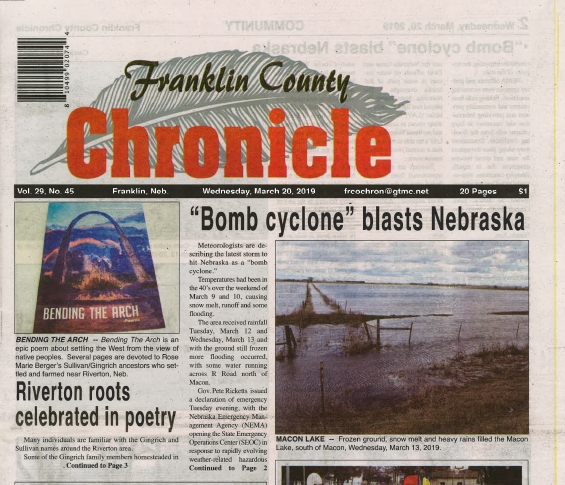 “Bending the Arch is an epic poem about settling the West from the view of native peoples. Several pages are devoted to Rose Marie Berger’s Sullivan/Gingrich ancestors who settled near Riverton, Neb. Many individuals are familiar with the Gingrich and Sullivan names around the Riverton area. Some of the Gingrich family members homesteaded in Smith County, Kan., while others settled in the Riverton area, farming south of Riverton for approximately 60 years. …