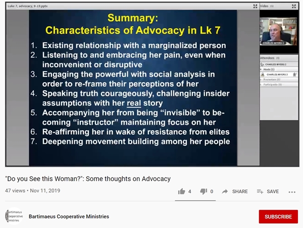 Ched Myers offers an 18-minute video on what it means to be an “advocate” by looking at Luke 7:36-8:3. The work of advocacy, he says, is “calling people in, both allies and adversaries, to the work of justice for all.”
