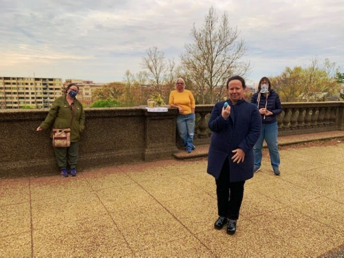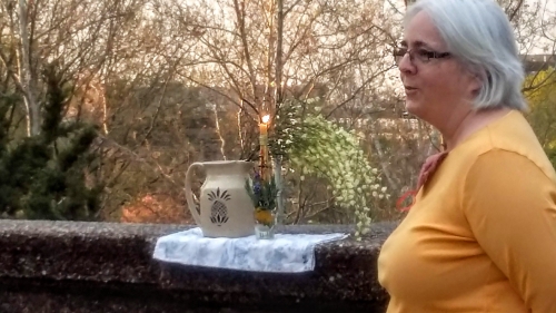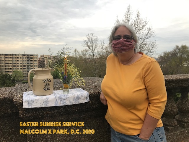 Thanks to the 5 women and one dog who got up “early on the first day of the week, while it was still dark” and “went to the tomb and saw that the stone had been removed from the entrance.” We encountered early morning runners, but no park police warning us away from the Falls Line in Malcolm X Park in D.C. So with iPhones for lyrics to “Christ Our Lord Is Risen Today,” sharing reading from John 20, my homemade Easter candle, a jug of water, an asperges of blooming broom, and Easter eggs dyed with red cabbage, we celebrated the incredible news we’d received, reflected on our times, recited our baptismal vows, got sprinkled, then cracked our Easter eggs together with joyous shouts of “He Is Risen! He Is Risen Indeed!” (All while mostly wearing our C-19 masks. What a season it has been!)