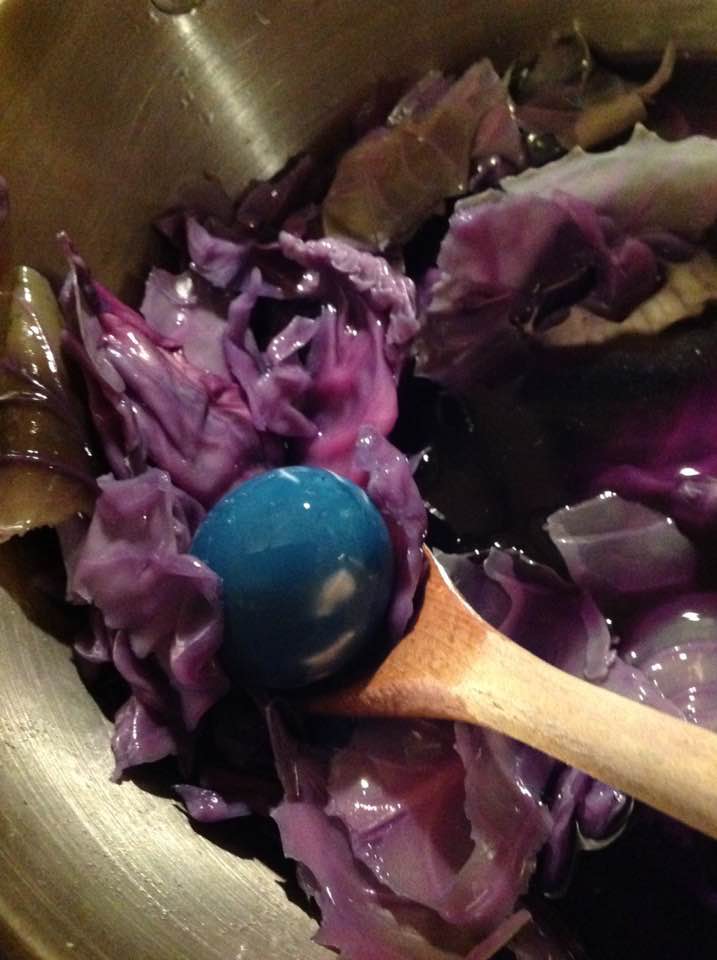 For blue eggs: Take 1 large red cabbage (about 1 pound) and tear up the leaves. Combine in a saucepan with 1 quart water, 1 tablespoon vinegar, and 1 tablespoon salt. Place in uncooked eggs. Bring to a solid boil, then cover and turn off heat. Let the whole thing cool (outside if possible), then put in the refrigerator over night. In the morning on Holy Saturday, gently remove eggs from the bath and let them dry. Once completely dry, you can lightly rub them with olive oil to return the sheen.