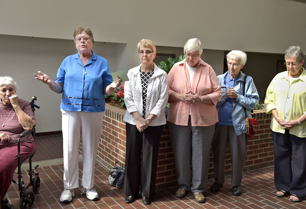 The Adorers pray before Thursday’s hearing resumes, Sister Martha, Sister Bernice, Sister George Ann, Sister Joan and Sister Linda. Photo by Lancaster Online’s Richard Hertzler.