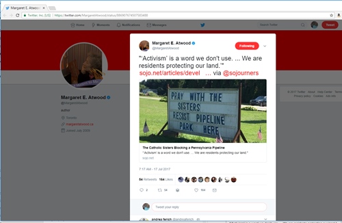 Then today I was alerted that Margaret Atwood herself retweeted Developers Are Trying to Build a Pipeline Through a Watershed. These Nuns Built a Chapel in Its Path by Heidi Thompson and myself on land defenders in Lancaster County, Penn., that was posted on the Sojourners website. Wow! (Thank you, @MargaretAtwood!)