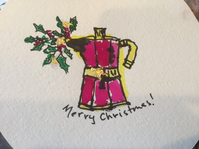 Well, it’s 70 degrees in Washington, D.C. today – ten days before Christmas. (Sure hope those folks in Paris at the climate summit are bold!) So Heidi and I made Christmas cards with her new “Andy Warhol” watercolors (actually, they are called Dr. Ph Martin).